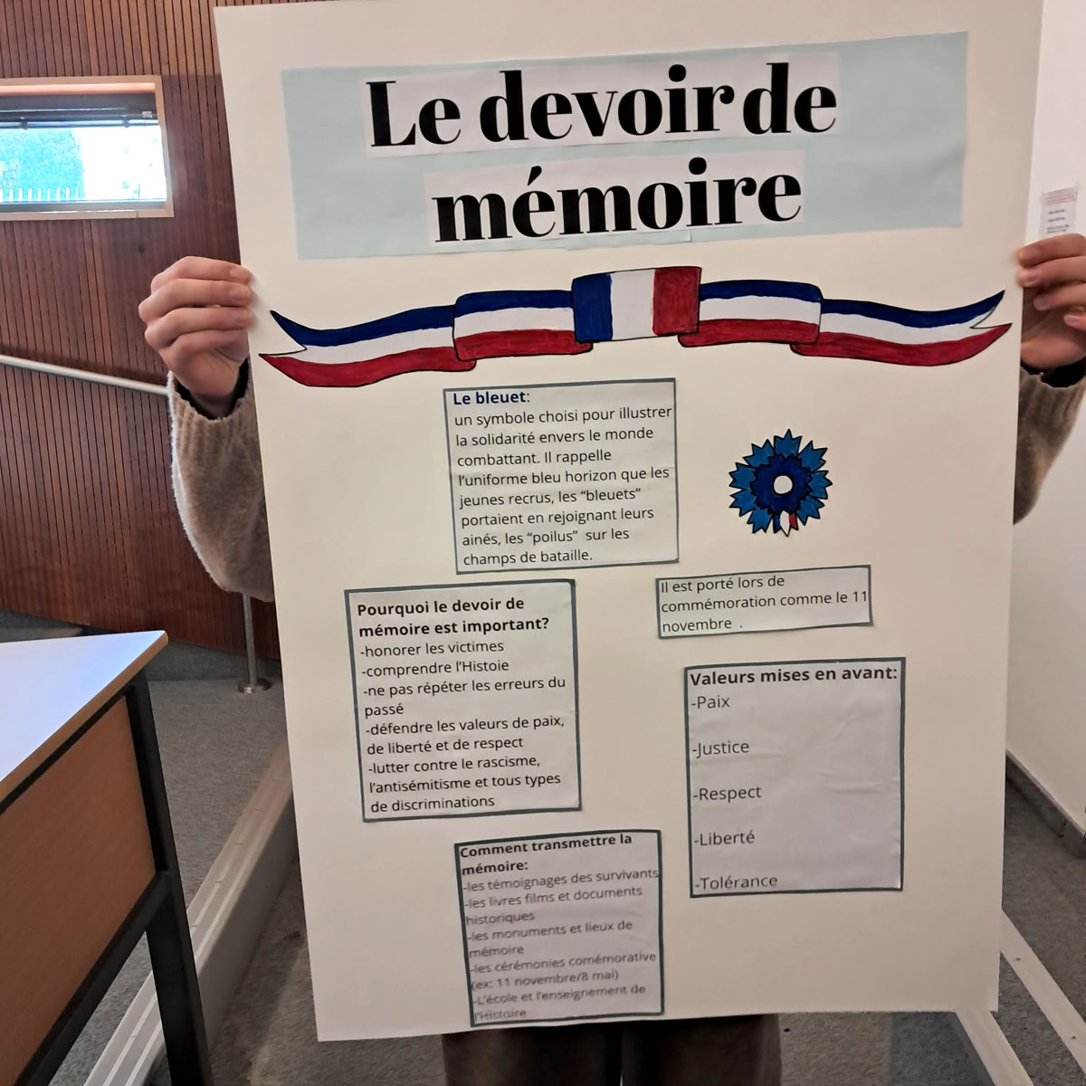 Lundi 23 mars, avec mes camarades, nous avons préparé une activité centrée autour du devoir de mémoire à l’occasion d’une journée de rencontre entre les lycéens de mon lycée, le lycée Simon Veil, et des élèves de 5ème et 4ème du collège Niki de Saint Phalle. Notre activité commençait tout d’abord avec la présentation d’une affiche sur le devoir de mémoire que nous avions préparé spécialement pour l’occasion.